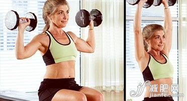 開始練習時,手肘彎曲,手臂敞開,從兩邊舉起啞鈴,見左圖;慢慢地向上抬高,手臂伸直,肘部高于耳朵,再慢慢放下回到起始位置。重復10次。