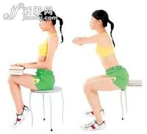 蹲坐姿勢(右):兩腳打開,與肩同寬,兩臂彎曲相疊,慢慢下蹲,使膝蓋彎曲90度。如果是初試者也可以背靠著墻做動作,這樣能伸展整個下肢的肌肉。15次為一組,做2~3組。