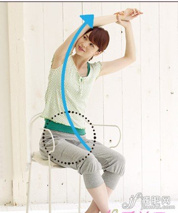 坐在椅子上做簡(jiǎn)單的拉伸手臂動(dòng)作,方向與手臂相反,能有效刺激腰部至手臂的肌肉,下腹也被帶動(dòng)起來(lái),向上提拉。