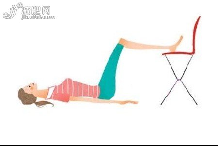 仰臥伸腿step1:仰躺在地板上,雙手自然放在身側,兩腿彎曲搭在椅子上。