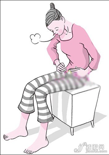 Step 1 腹式呼吸。吸氣:雙腿稍微分開,屈膝淺坐于椅子上,大腿與小腿保持90度直角,上身挺直,雙肩放松,雙手放在骨盆兩側(cè)。然后吸氣,腰背微微拉伸,肩胛骨向后打開下壓,令胸廓外擴(kuò),氧氣進(jìn)入體內(nèi),充分填充腹部,令腹部鼓起。