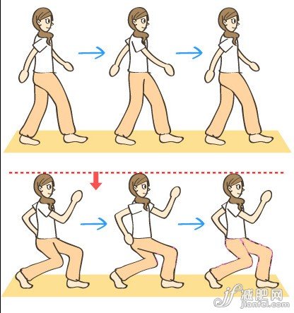 5、先用正常的走路方式向前步行50步,然后雙膝向前彎曲,臀部下沉,上身挺直,保持半蹲的姿勢向前走30步。