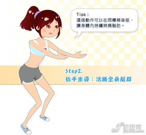 step1.翹屁屁:預(yù)防下半身肥胖 雙腳與肩同寬,雙手交叉放在肩膀。身體慢慢往下降,盡量將屁股稍微往后坐?!》磸?fù)起蹲二十次?! ?/p>