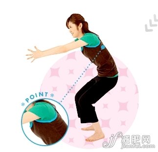 3、然后雙腿向前屈膝,大腿與小腿成90度,臀部下沉,注意不要后凸,上身隨之微微前傾,與大腿成90度,在身后手指交叉握緊的雙手松開(kāi),雙臂往前擺,平舉再擊掌,保持手掌合十的姿勢(shì)3秒,同時(shí)緩緩呼氣。