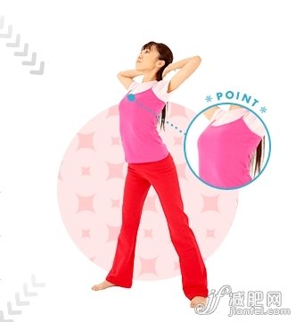 2、右腳往右大大地跨出一步,步幅是肩寬的兩倍,雙臂向左右屈肘,雙手扶著后腦勺,向后打開胸廓,腰以上的部位向上仰起,吸氣3秒。
