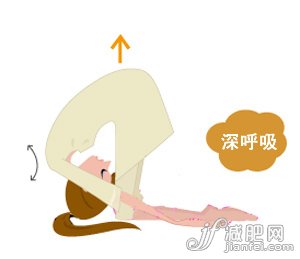 3、向前移動一段時間后,利用腰部向上提拉,帶動臀部進一步抬起,同時頭頂離地并收在大腿前,但手背依然觸碰床面,保持這個姿勢深呼吸一段時間。