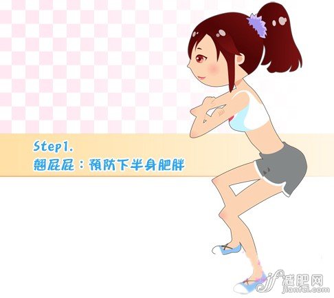 step1.翹屁屁:預(yù)防下半身肥胖 雙腳與肩同寬,雙手交叉放在肩膀。身體慢慢往下降,盡量將屁股稍微往后坐。 反復(fù)起蹲二十次?! ?br / data-Y5Lc="CeYRkJ">