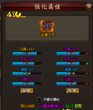 43u《霸將三國》仙翼乃是彰顯個性的絕佳系統(tǒng),游戲初始就會送玩家一對仙翼,通過主界面下方的仙翼按鈕進(jìn)入界面佩戴。仙翼通過升星能夠變得更加炫酷,同時可獲得更多的屬性加成。參加整點BOSS可獲得大量升星石。每個仙翼都可以鑄魂,通過鑄魂可獲得相應(yīng)的屬性加成,不過,仙翼鑄魂并不是百分百成功,有一定的概率失敗。