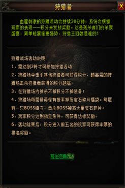 首先,只有達(dá)到2轉(zhuǎn)的玩家才可參加狩獵活動哦,當(dāng)滿足這一條件的勇士們,每天下午的16:30即可前往狩獵戰(zhàn)場了。在狩獵場中,玩家只需擊殺其他狩獵者即可獲得積分,越高層的狩獵場擊殺狩獵者獲得的積分越高。并且,在狩獵場內(nèi)被殺是不掉積分和裝備的呢。