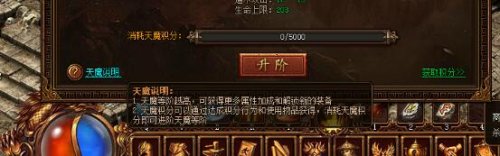 來吧!這就是積分獲得的關(guān)鍵。等級、攻擊、光翼、內(nèi)功、戰(zhàn)神神威達(dá)到相應(yīng)的等級就可以獲得數(shù)萬的天魔積分。如果你覺得這一切都來得太慢,索性購買兩顆高級/超級天魔珠,一口氣提升幾階的天魔級別。也許,這就是傲天金裝傳奇中土豪們最愛干的一件事。你是不是土豪?不妨測試一下唄。天魔已現(xiàn),心魔未除,不必壓抑,自由轉(zhuǎn)化便好,這才是融會貫通、海納百川的實(shí)力與胸懷。