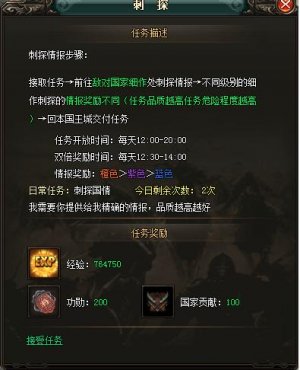 在2025年百變國戰(zhàn)網(wǎng)頁游戲游戲王國《我在三國》中,每天12:30-14:00開啟雙倍刺探,70級及以上玩家可前往王城內(nèi)NPC刺探校尉處接受刺探任務(wù)。任務(wù)級別分為橙色、紫色、藍(lán)色三種級別。不同級別的細(xì)作刺探的情報(bào)獎勵不同(任務(wù)品質(zhì)越高危險(xiǎn)程度也越高),領(lǐng)取任務(wù)后,根據(jù)任務(wù)提示前往敵對國家細(xì)作處刺探情報(bào),找到并獲取情報(bào)以后。回到本國王城處交付任務(wù)。