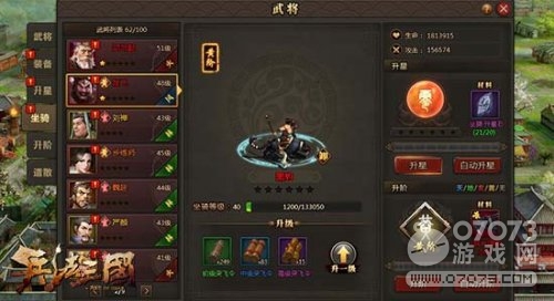 所有武將可以進行升星與升階,最高可升至六星,品階分為天地玄黃無五階,最高可升至天階。每個武將都可以騎乘一匹坐騎,紅色與橙色武將則有專屬坐騎,坐騎同樣可以升級、升星與升階,所有的培養(yǎng)都將提高武將的綜合實力!