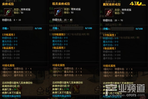 鍛造3階麻痹戒指魔域麻痹戒指,麻痹幾率4%,秘法鍛造需要消耗金剛石800顆,秘法鍛造必定成功。普通消耗金剛石50顆,再使用普通鍛造21次后必定成功,普通鍛造成功率為7.5%,普通鍛造失敗后每次減少秘法鍛造消耗10顆。