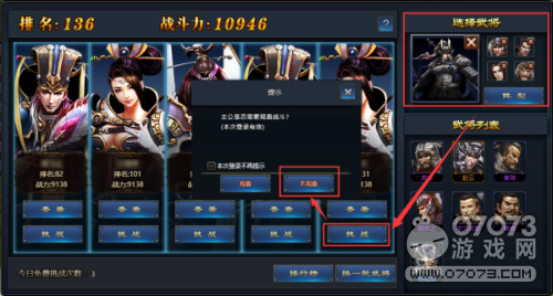 只要玩家在相應(yīng)的界面中設(shè)置好武將上陣的陣型,然后在挑戰(zhàn)時(shí)選擇“不觀看”,即可將戰(zhàn)斗過(guò)程移至后臺(tái),效果和跳過(guò)戰(zhàn)斗是差不多的,不過(guò)和跳過(guò)戰(zhàn)斗不同的是,它是可以在隨時(shí)進(jìn)入戰(zhàn)斗場(chǎng)景觀看戰(zhàn)斗的。這樣的操作可以應(yīng)用在多個(gè)戰(zhàn)斗場(chǎng)景里面,所以游戲中的戰(zhàn)斗實(shí)際上是十分省時(shí)省力的。不過(guò)有了這樣的操作之后,游戲?qū)ν婕业拇缶钟^和策略能力就有了更高的要求,不然這游戲沒(méi)法玩下去。