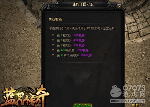 一旦玩家進入第十層,那么就可以迅速的找到迷陣十層守衛(wèi),不要耽誤時間快速的領(lǐng)取獎勵,因為獎勵是按照玩家到達的名詞來發(fā)放的,最高可獲得5000禮券,最低也可以獲得1000禮券,大家要知道,這個玩法與戰(zhàn)斗力無關(guān),而前幾名到達的玩家可以在密室擊殺BOSS,獲得大量的獎勵,且最好可以爆6轉(zhuǎn)裝備。