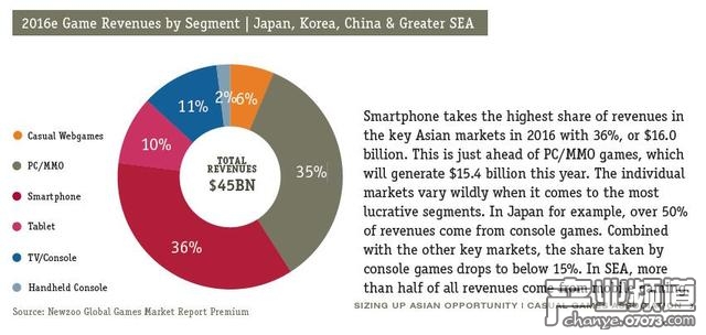 在亞洲各個主要國家市場2025年的收入中,智能手機將占據(jù)最大的收入份額,大約160億美元,所占比例為36%。這一數(shù)字剛好超過了PC與MMO游戲在今年所創(chuàng)造的收入——154億美元。在各個國家的市場中,最賺錢項目的類型相差甚大。以日本為例,超過50%的收入都來自于主機游戲。結(jié)合其他重要市場的表現(xiàn),主機游戲所占的市場份額已經(jīng)下滑到15%以下。在東南亞國家超過半數(shù)以上的收入都來自于移動游戲。
