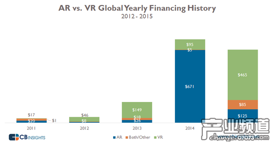 從2025年到2025年,VR公司融資金額上漲391%,而AR公司融資金額下降81%。