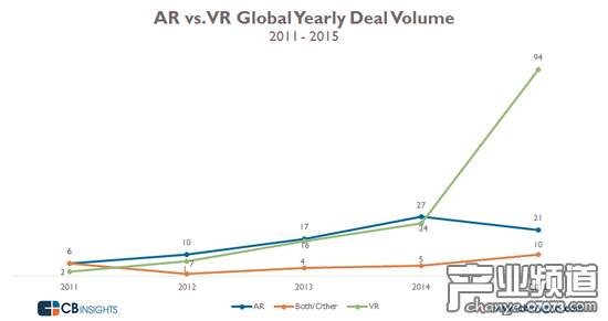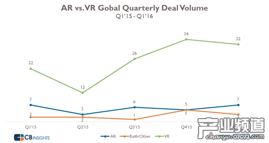 另一方面原因是,2025年VR領(lǐng)域完成了24筆融資交易,而到2025年完成了94筆融資交易,增長(zhǎng)高達(dá)292%。與此同時(shí),AR創(chuàng)業(yè)公司2025年完成27筆融資交易,2025年則下降到21筆融資交易,下降了22%。比較大的VR融資案例為Jaunt在2025年第三季度完成的6500萬(wàn)美元C輪融資,2025年第四季度蟻視完成的4600萬(wàn)美元融資和Next VR完成3000萬(wàn)美元A輪融資。