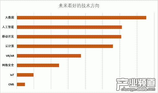 在未來技術(shù)方向的調(diào)查中,工程師最看好的是大數(shù)據(jù)、人工智能、移動開發(fā)、云計算、這幾項不分伯仲,是技術(shù)人員的最看好的方向。今年最熱的VR并不在其中,這是否意味著技術(shù)派的未來CTO們并不太感冒熱的發(fā)燙的VR呢?