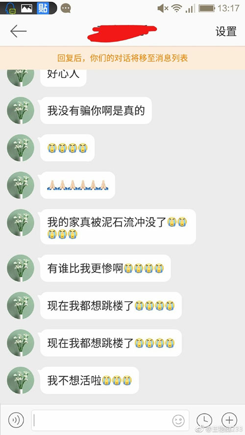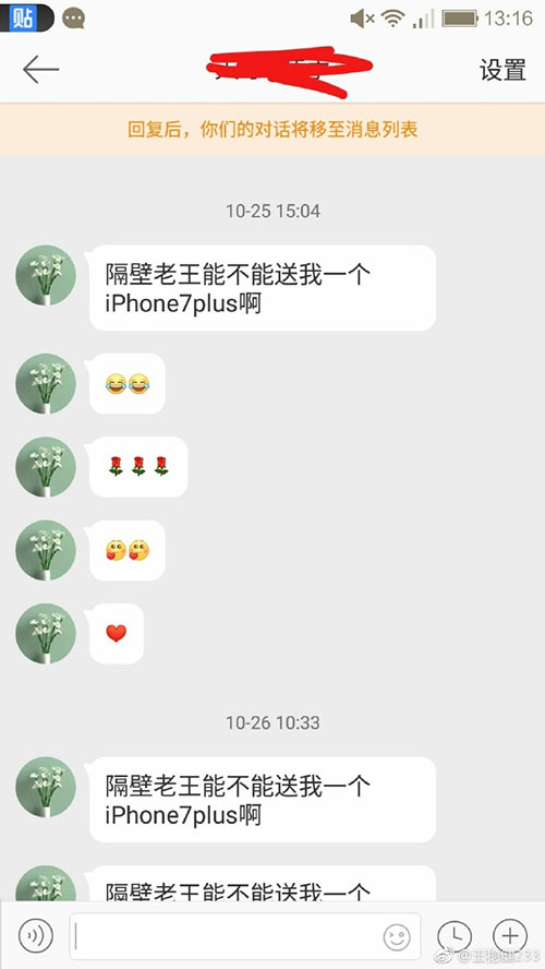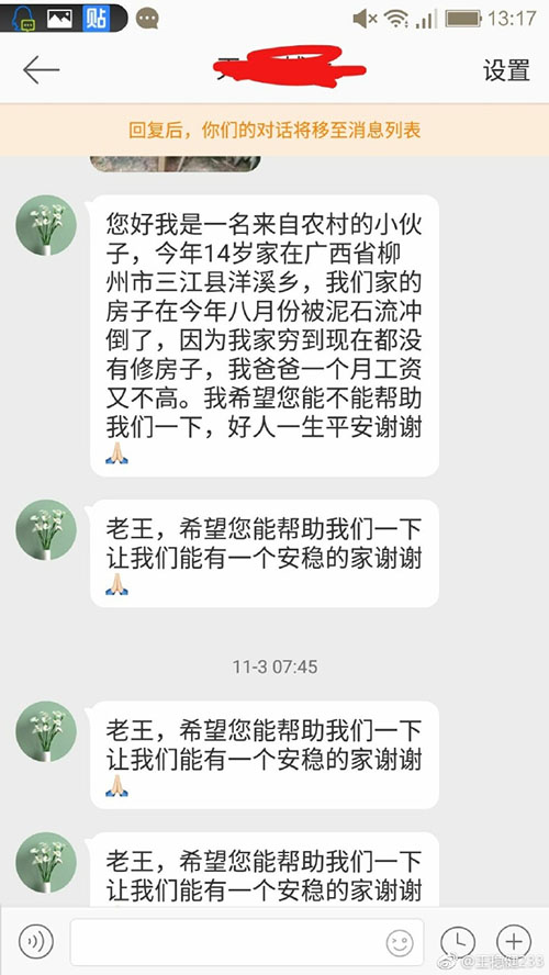 老王微博部分原文:先看這個(gè)人給我的聊天記錄,第一條就是什么給我個(gè)蘋(píng)果手機(jī)吧,后面開(kāi)始問(wèn)我要微信要紅包,然后轉(zhuǎn)頭就是說(shuō)自己家碰到泥石流??要我給他一萬(wàn)塊錢。