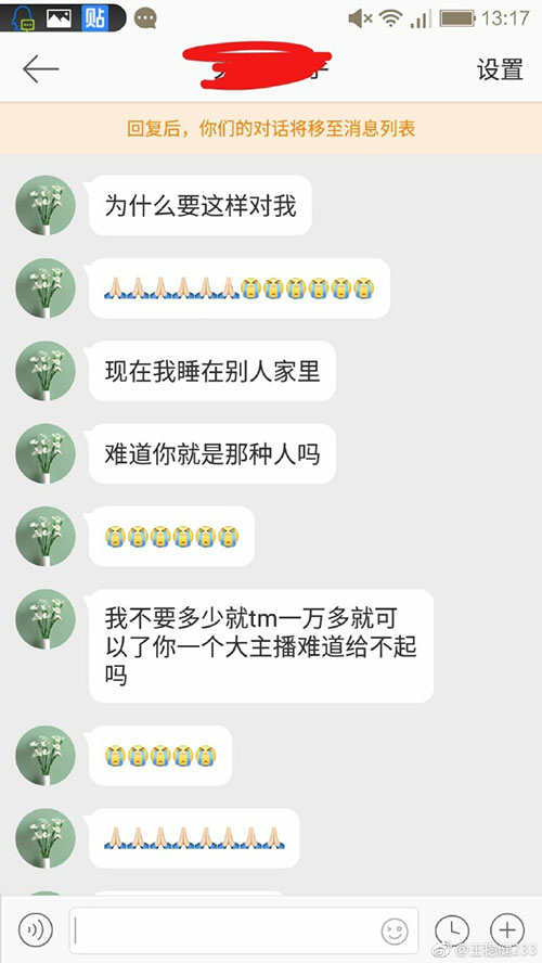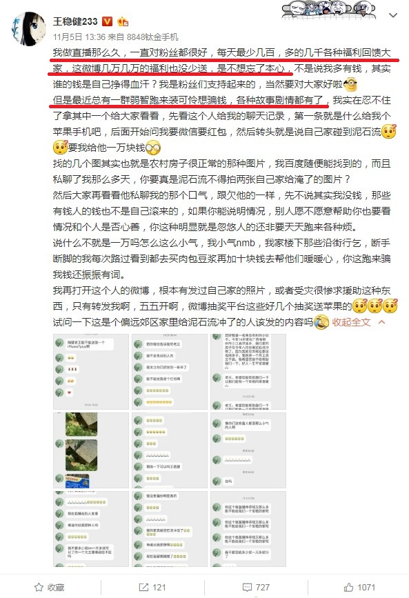 看微博和聊天記錄,很明顯可以看到這個(gè)粉絲就是道德綁架老王來(lái)騙錢的,自己家遭泥石流了還有心思看直播要Iphone?更何況誰(shuí)的錢都不是白掉下來(lái)的,就算要幫助也要看情況而論,像這樣明顯的騙子,老王犯蠢了才會(huì)給錢。