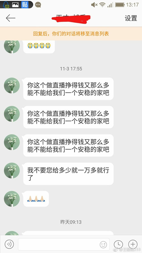 這兩年直播圈的火熱所有人有目共睹,主播們的身價(jià)也隨著直播業(yè)的發(fā)展而水漲船高,“千萬(wàn)級(jí)”的主播更是層出不窮。不過(guò)成名有時(shí)候也會(huì)帶來(lái)不少煩惱,全民直播的隔壁老王最近就遇到了糟心事,有一個(gè)極端粉絲在微博上天天私信他,自稱自己家遭了泥石流,要老王送Iphone和現(xiàn)金,并表示這點(diǎn)錢對(duì)于大主播不算什么,粉絲遇難主播不該幫忙嗎?