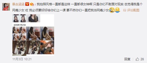 從涵涵的微博可以看出,她非常感激自己粉絲的支持,但對于顏值這個東西還是很在意的,不想被粉絲們認為是網(wǎng)癮少女。其實涵涵也不用這么糾結(jié)的,畢竟粉絲們大多時候都是在調(diào)侃,如果真的不喜歡的話,那就根本不會關(guān)注她了。