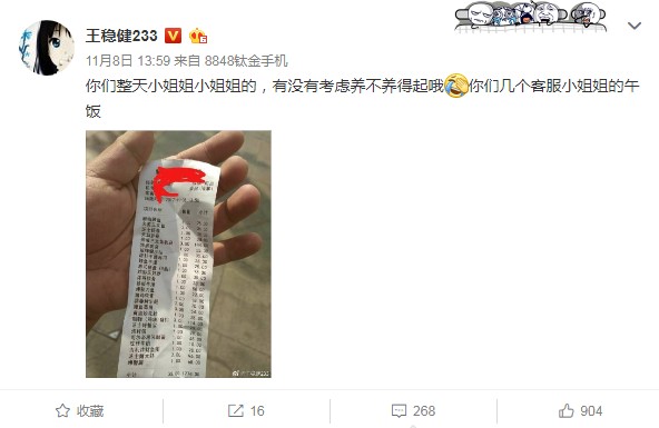 按老王在微博中的說法來看,午飯是幾個客服小姐姐和他一起吃的,照這樣算,老王的伙食標準在幾百一個人。也難怪老王自己都吃不消了,在微博上吐槽:讓你們天天喊客服小姐姐,就這消費水平,幾個人能養(yǎng)得起啊。