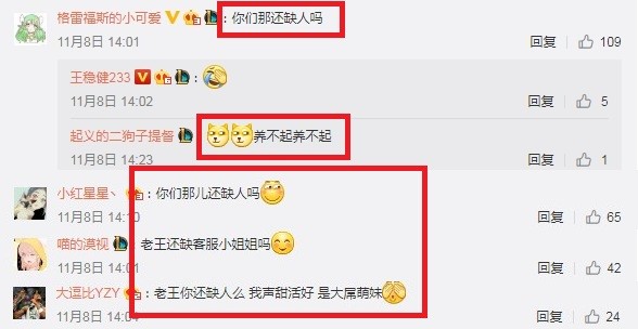 當然粉絲們的回復(fù)很直接,自己確實是養(yǎng)不起,但可以投靠老王啊。然后就可以看到在老王微博下滿滿的應(yīng)聘回復(fù):老王還缺客服小姐姐嗎?