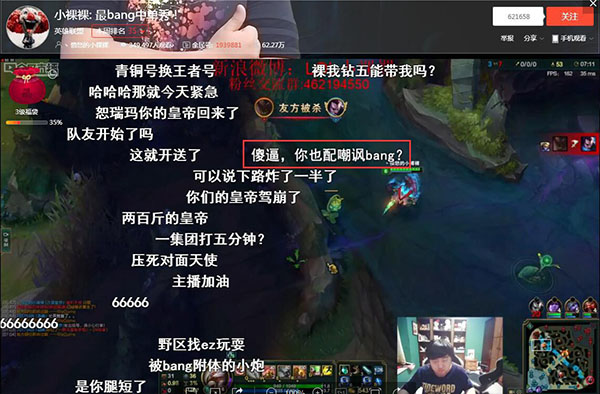 看著自家主播被罵,小裸裸的粉絲不樂意了,直接在直播間互剛了起來:小裸裸為什么沒資格?人家也打過LPL,上過國服第一,Bang這次S7打得這么菜,還不準(zhǔn)別人調(diào)侃了?不得不說,小裸裸的粉絲還是說得挺有理的,電子競(jìng)技菜就是原罪,整個(gè)電競(jìng)?cè)Χ荚诔爸SBang,小裸裸作為一個(gè)前職業(yè)選手怎么就不能說了?
