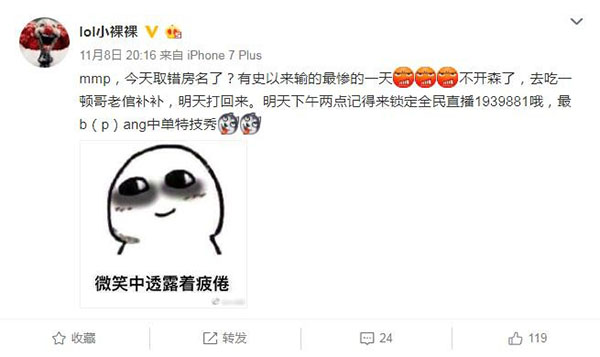 不過小裸裸的脾氣就好多了,沒有繼續(xù)跟這些人計(jì)較,馬上把房間名改了,并且發(fā)微博表示房間名取錯(cuò)了,應(yīng)該叫“最Pang中單秀”的,畢竟小裸裸也算一個(gè)180斤的大胖了。
