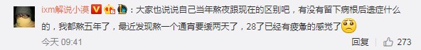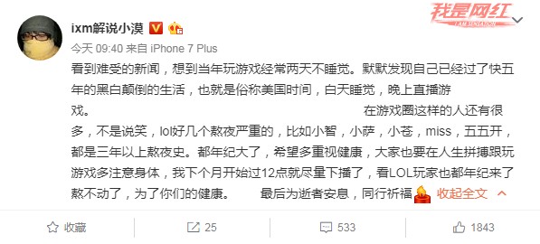 以下是小漠微博原話:看到難受的新聞,想到當(dāng)年玩游戲經(jīng)常兩天不睡覺(jué)。默默發(fā)現(xiàn)自己已經(jīng)過(guò)了快五年的黑白顛倒的生活,也就是俗稱(chēng)美國(guó)時(shí)間,白天睡覺(jué),晚上直播游戲。在游戲圈這樣的人還有很多,不是說(shuō)笑,lol好幾個(gè)熬夜嚴(yán)重的,比如小智,小薩,小蒼,miss,五五開(kāi),都是三年以上熬夜史。都年紀(jì)大了,希望多重視健康,大家也要在人生拼搏跟玩游戲多注意身體,我下個(gè)月開(kāi)始過(guò)12點(diǎn)就盡量下播了,看LOL玩家也都年紀(jì)來(lái)了熬不動(dòng)了,為了你們的健康。最后為逝者安息,同行祈福。