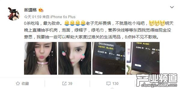 張琪格在凌晨發(fā)出一條微博,稱:0殺吃雞,最為致命。還表示明天晚上直播抽手機(jī)殼,泡面,綠帽子,綠毛巾,營養(yǎng)快線等等東西,她覺得抽現(xiàn)金沒意思,要抽一些可以幫助大家度過難關(guān)的生活用品。