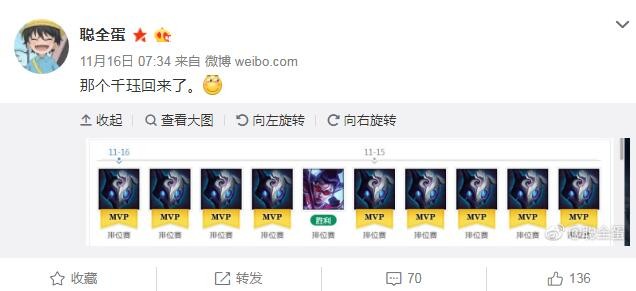 看著聰全蛋這一排全是MVP的戰(zhàn)績,相信大家能夠感受到新版本千玨的強(qiáng)度有多恐怖了。全民直播的聰全蛋之前一直自封“國服第一千玨”,但因為自己直播風(fēng)格太過奇葩而被不少網(wǎng)友吐槽為“國服第一智障”。這次的新版本算是滿足了他“國服第一千玨”的夙愿,成功在野區(qū)掌控雷電,興奮不已的他還跑去發(fā)了條微博:那個千玨回來了!
