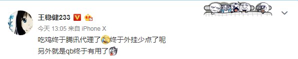 老王平時主要是在全民直播LOL,一般都是在臨近下播或者休息的時候玩吃雞,曾經(jīng)為了抵制外掛和不少主播對剛過,算得上是吃雞鐵粉了。這次騰訊代理吃雞國服后,他的微博也是言簡意賅地表達了眾多玩家們的心聲:外掛應該會少了,但QB怕是要嘩嘩地充了。這番表態(tài)自然引起了網(wǎng)友們的共鳴,紛紛聚集在老王微博下吐槽了起來。
