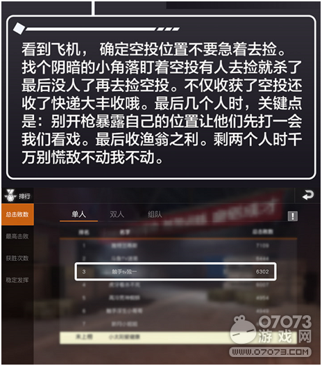 剩下最后幾個(gè)人時(shí)沒把握擊殺就別開槍暴露自己的位子,讓他們先打一會(huì)我們看戲,最后收漁翁之利。剩兩個(gè)人時(shí)千萬別慌敵不動(dòng)我不動(dòng),敵動(dòng)了你也別動(dòng)就趴著打他亂槍掃死。不過要注意毒,別被毒死了把到嘴的雞讓給了別人。