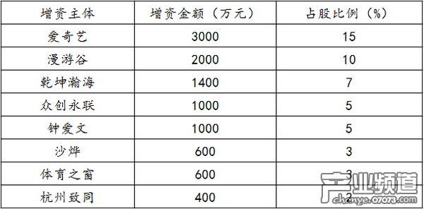 公告顯示八家增資方分別為愛(ài)奇藝、漫游谷、乾坤瀚海、眾創(chuàng)永聯(lián)、鐘愛(ài)文、沙燁、體育之窗和杭州致同。其中漫游谷擬出資2000萬(wàn)元,占廣州糖谷增資后總股本的10%;愛(ài)奇藝擬出資3000萬(wàn)元,占廣州糖谷總股本的15%,溢價(jià)部分作為廣州糖谷的資本公積。
