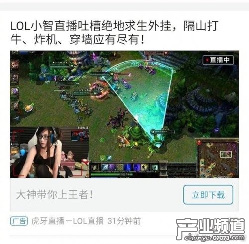 現(xiàn)在直播平臺的廣告,其惡心人的程度已經(jīng)僅次于網(wǎng)頁游戲廣告了。在打開移動端網(wǎng)頁和自媒體時,總能看到鋪天蓋地的直播平臺廣告,不過絕大部分毫無下限,僅以博眼球騙點擊為目的。虎牙直播的這個廣告,標題是“LOL小智直播吐槽絕地求生外掛,隔山打牛、炸機、穿墻應有盡有!”不過下面的“視頻截圖”里竟然是一個大胸萌妹。眾所周知,小智是從來不露面的。這個廣告真是太無厘頭的。