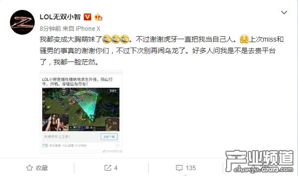 小智表示:我都變成大胸萌妹了。不過謝謝虎牙一直把我當自己人。上次miss和騷男的事真的謝謝你們,不過下次別再鬧烏龍了。好多人問我是不是去貴平臺了,我都一臉茫然。