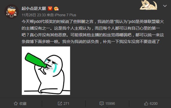 英雄聯(lián)盟年度頒獎盛典在上周日圓滿落幕,與現(xiàn)場的和諧氣氛不同,盛典后的電競?cè)s是一地雞毛,起因就是起小點在獲獎時一句“PDD是英雄聯(lián)盟最火的主播,沒有之一”的欠妥發(fā)言。事后,起小點因此遭到了眾多玩家和主播的抨擊,雖然最終他選擇了出面道歉,但略帶敷衍的態(tài)度沒能讓玩家們買賬,爭端仍在繼續(xù)。