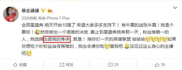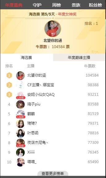 臨近年末,各大公司都忙碌了起來,努力為一年的工作畫上圓滿句號,直播平臺也不例外。全民直播就在近期籌辦了全民盛典活動,所有主播都可以從粉絲的禮物中獲得“牛票”,最終得票數最多的主播會在年末的盛典上獲得最佳人氣主播等各種獎項。毫無疑問,這樣的獎項爭奪必然激烈,主播們?yōu)榱似睌狄彩鞘贡M了渾身解數,甚至像電競周冬雨涵涵直接都出賣起了“身體”拉票。