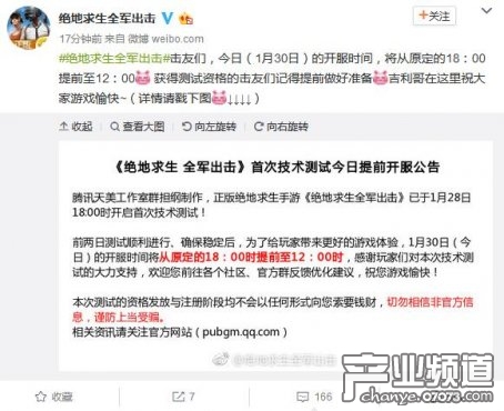 就在剛剛,騰訊正版“吃雞”手游《絕地求生全軍出擊》官微公告稱(chēng)正版吃雞手游《絕地求生全軍出擊》今日12點(diǎn)提前開(kāi)測(cè)“今日(1月30日)的開(kāi)服時(shí)間,將從原定的18:00提前至12:00”。