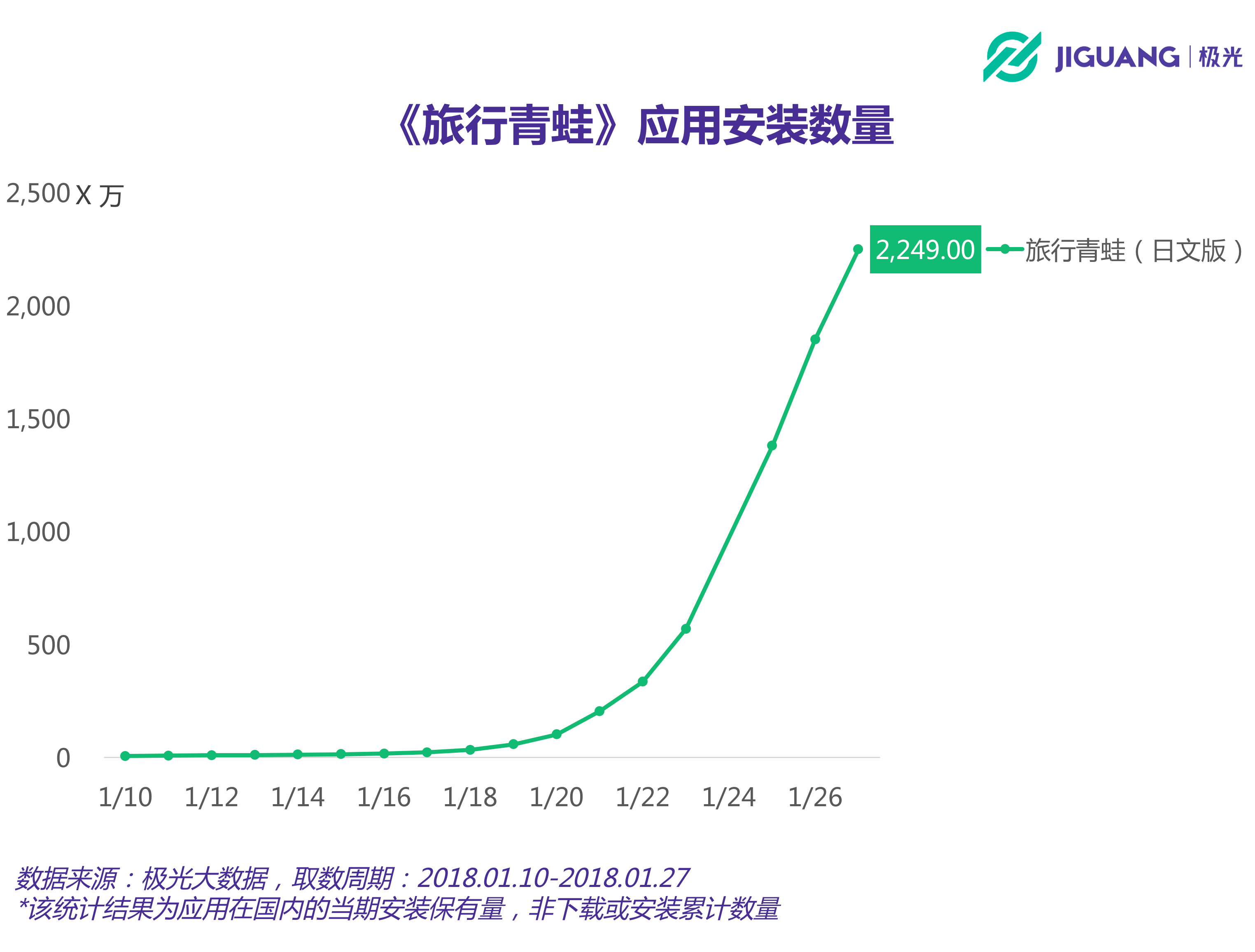 從安裝數(shù)量的曲線走勢可知,這款游戲在國內(nèi)經(jīng)過短暫的發(fā)酵期后,從1月中旬開始進(jìn)入快速增長期。根據(jù)極光大數(shù)據(jù)的統(tǒng)計(jì)結(jié)果,截至今年1月27日,《旅行青蛙》日文版在國內(nèi)的安裝數(shù)量已經(jīng)達(dá)到2,249萬。