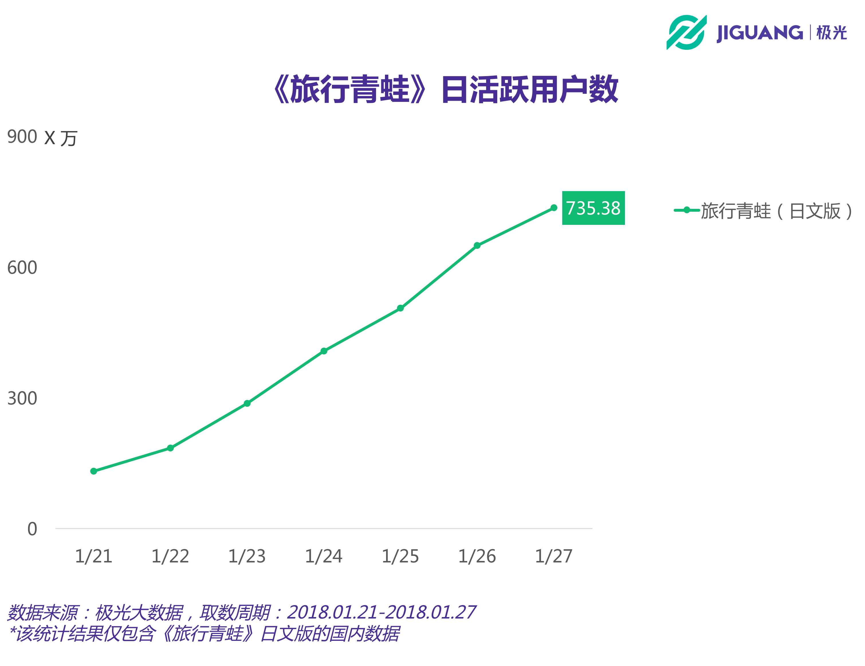 截至1月27日,《旅行青蛙》日文版的日活躍用戶數(shù)已經(jīng)突破700萬大關(guān)??紤]到這款游戲在國內(nèi)的話題引爆時(shí)間點(diǎn)為1月中旬,其增長勢頭之迅猛由此可見一斑。