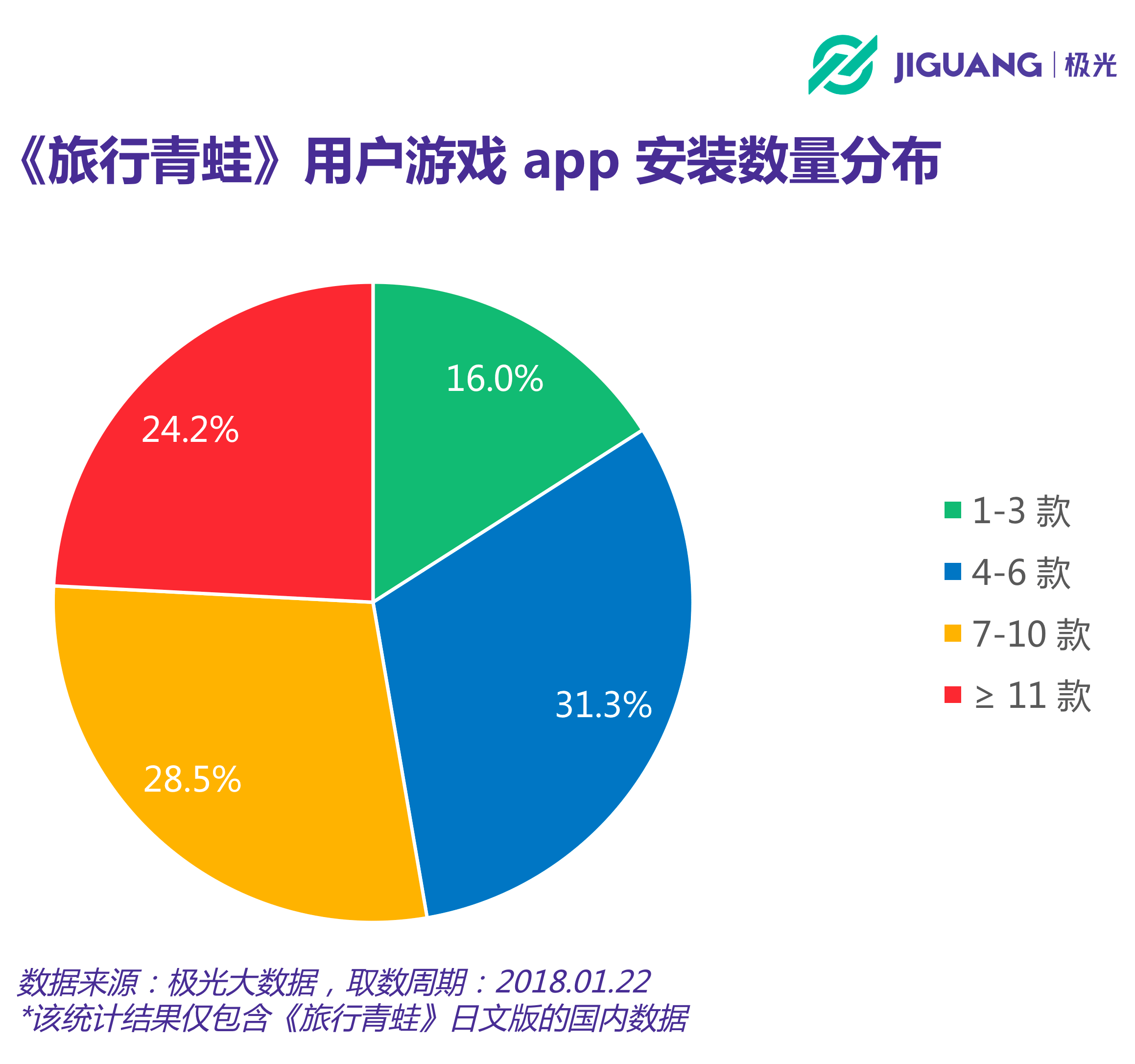 根據(jù)極光大數(shù)據(jù)的統(tǒng)計(jì)結(jié)果,設(shè)備上安裝有1-3款游戲類應(yīng)用的《旅行青蛙》日文版玩家占比為16%,4-6款的占比為31.3%。值得注意的是,重度游戲玩家在《旅行青蛙》日文版中占據(jù)著較大的比例,有52.7%的玩家所安裝的游戲數(shù)量在7款以上。