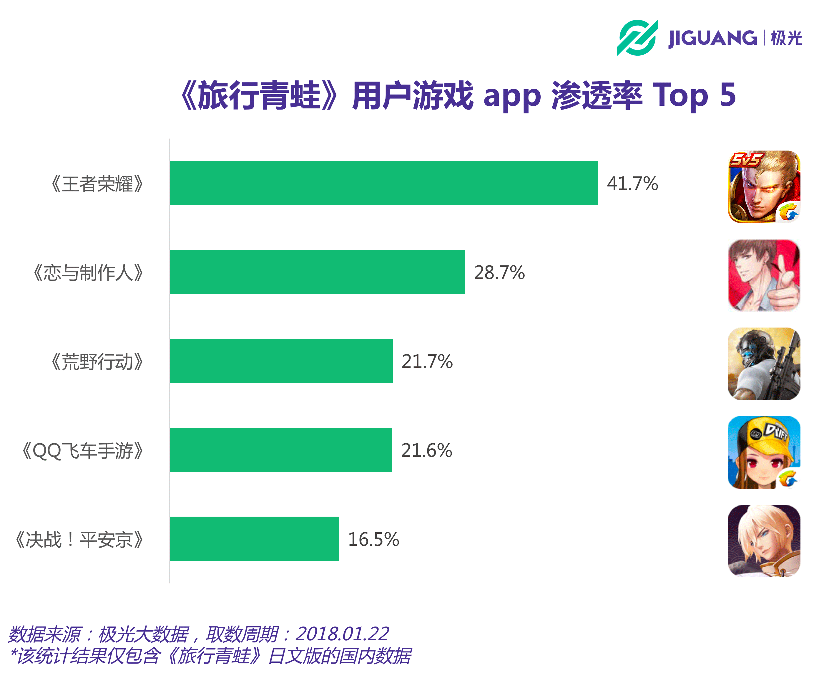 在《旅行青蛙》日文版的玩家群體中,滲透率最高的游戲是《王者榮耀》。截至1月22日,《王者榮耀》在目標(biāo)玩家群體中的滲透率達(dá)到41.7%,顯著高于其它游戲。同樣作為“養(yǎng)成類”游戲的爆款,《戀與制作人》在目標(biāo)群體中也有著28.7%的滲透率,而網(wǎng)易旗下的《荒野行動》則為21.7%。