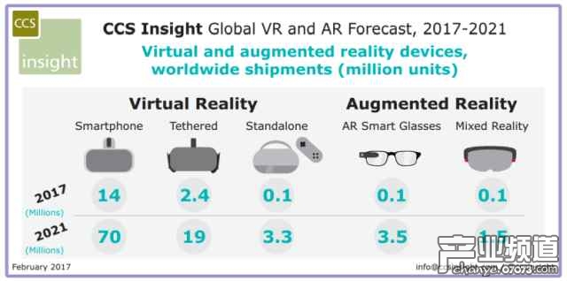 CCS Insight預(yù)測,2025年智能手機VR頭顯的銷售量約為1400萬臺,2025年上升至2500萬,到2025年則達(dá)到7000萬。