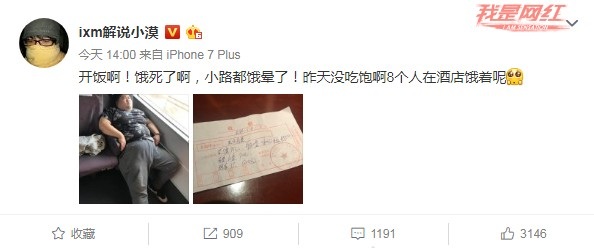 不過更秀的還在后邊,按理說吃這么多怎么都飽了吧,結果第二天小漠直接在微博上傳了小路的照片并表示小路昨天都沒吃飽,現(xiàn)在都要餓暈了。