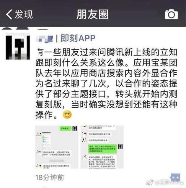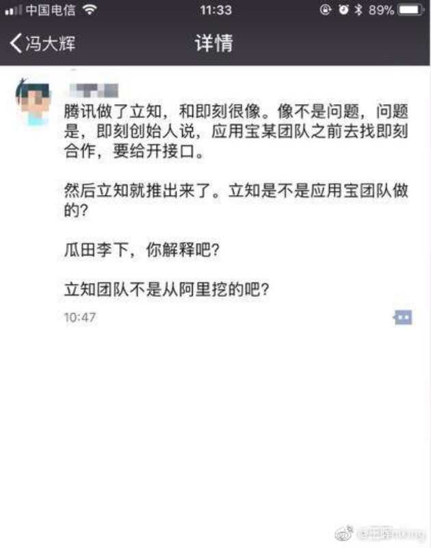 今日,知名媒體人馮大輝在朋友圈提到,“騰訊做了立知,和即刻很像,像不是問題,問題是,即刻創(chuàng)始人說,應(yīng)用寶某團隊之前去找即刻合作,要給開接口,然后立知就推出來了。立知是不是應(yīng)用寶團隊做的?”