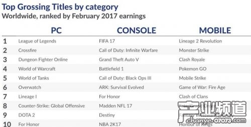 PC平臺前十名依次是:《英雄聯(lián)盟》、《穿越火線》、《地下城與勇士》、《魔獸世界》、《坦克世界》、《守望先鋒》、《天堂1》、《CSGO》、《Dota 2》和《榮耀戰(zhàn)魂》;